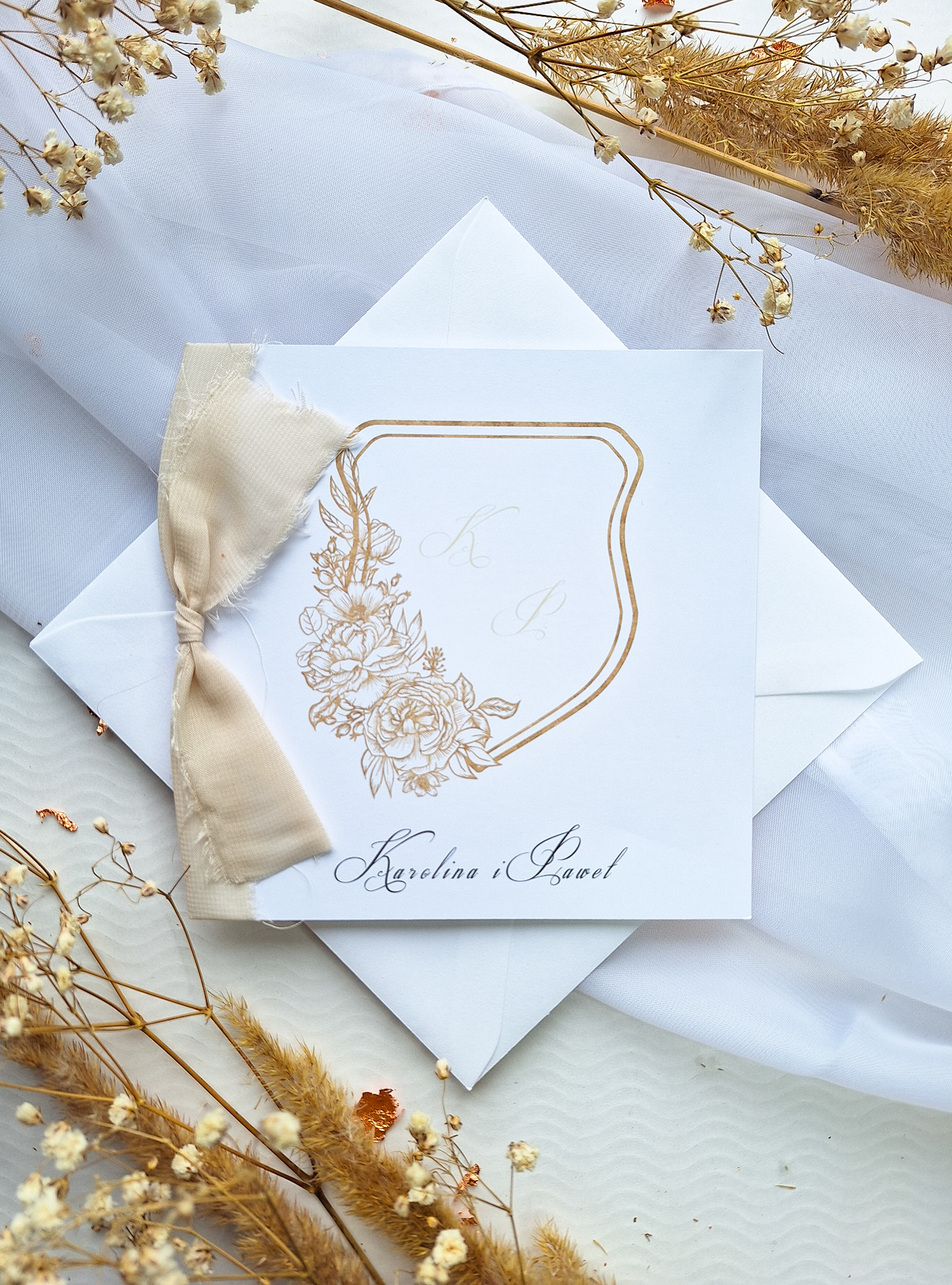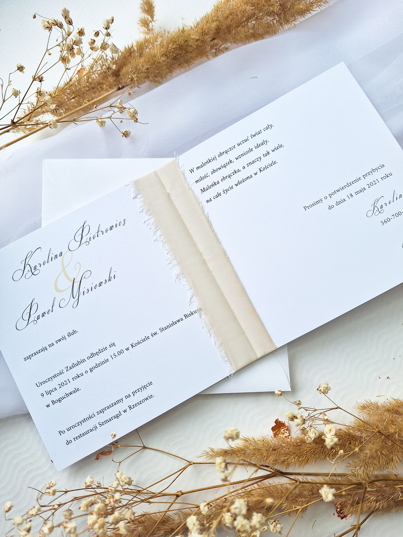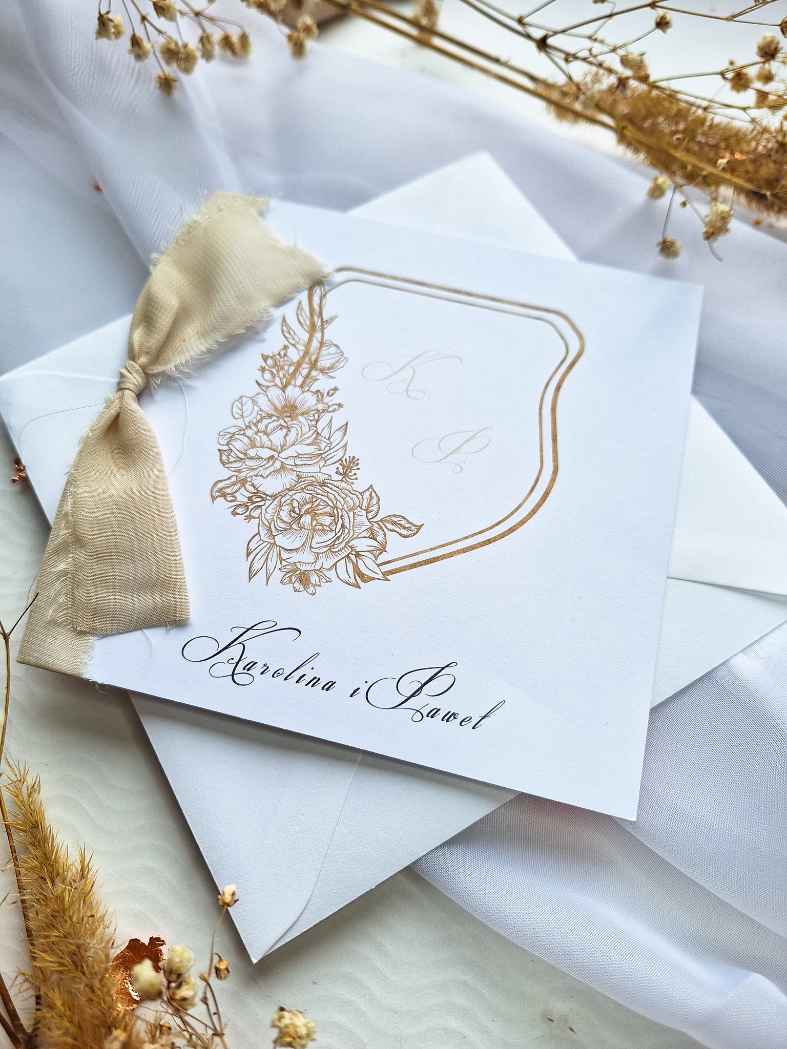 Delikatne zaproszenia z subtelnymi, beżowymi kwiatami w tradycyjnej otwieranej formie. Drukowane dwustronnie na sztywnym matowym papierze 300g. Przewiązane szyfonową wstążką.