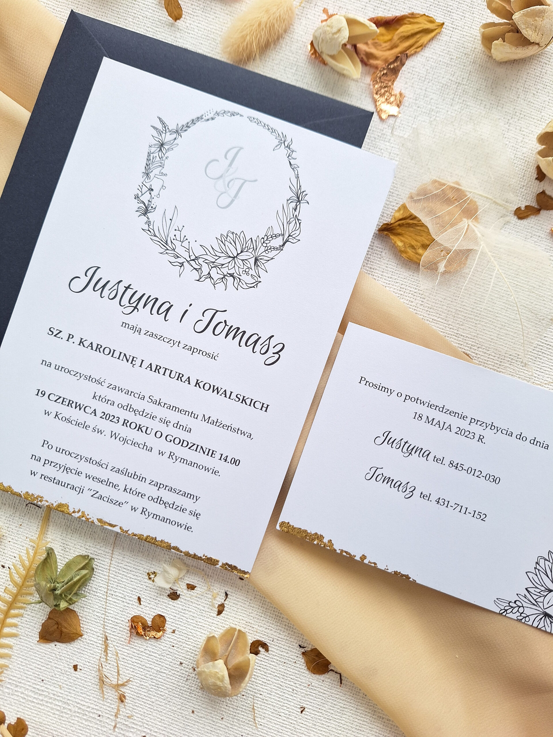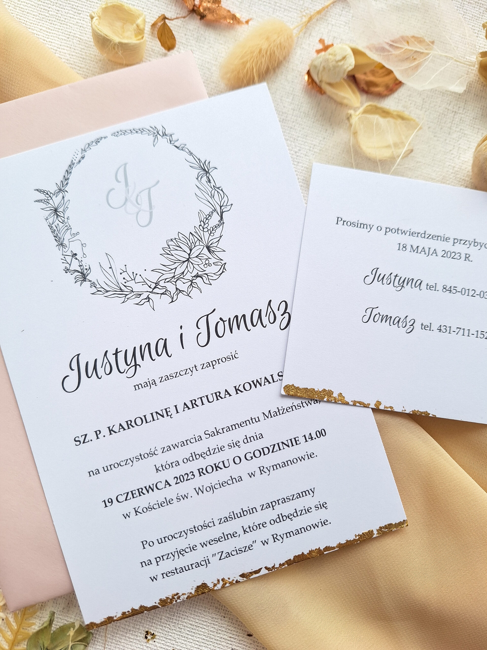 Minimalistyczne zaproszenia jednokartkowe z dodatkowym bilecikiem. Drukowane jednostronnie na białym, matowym papierze 350g. Brzegi zaproszenia ręcznie pozłacane.