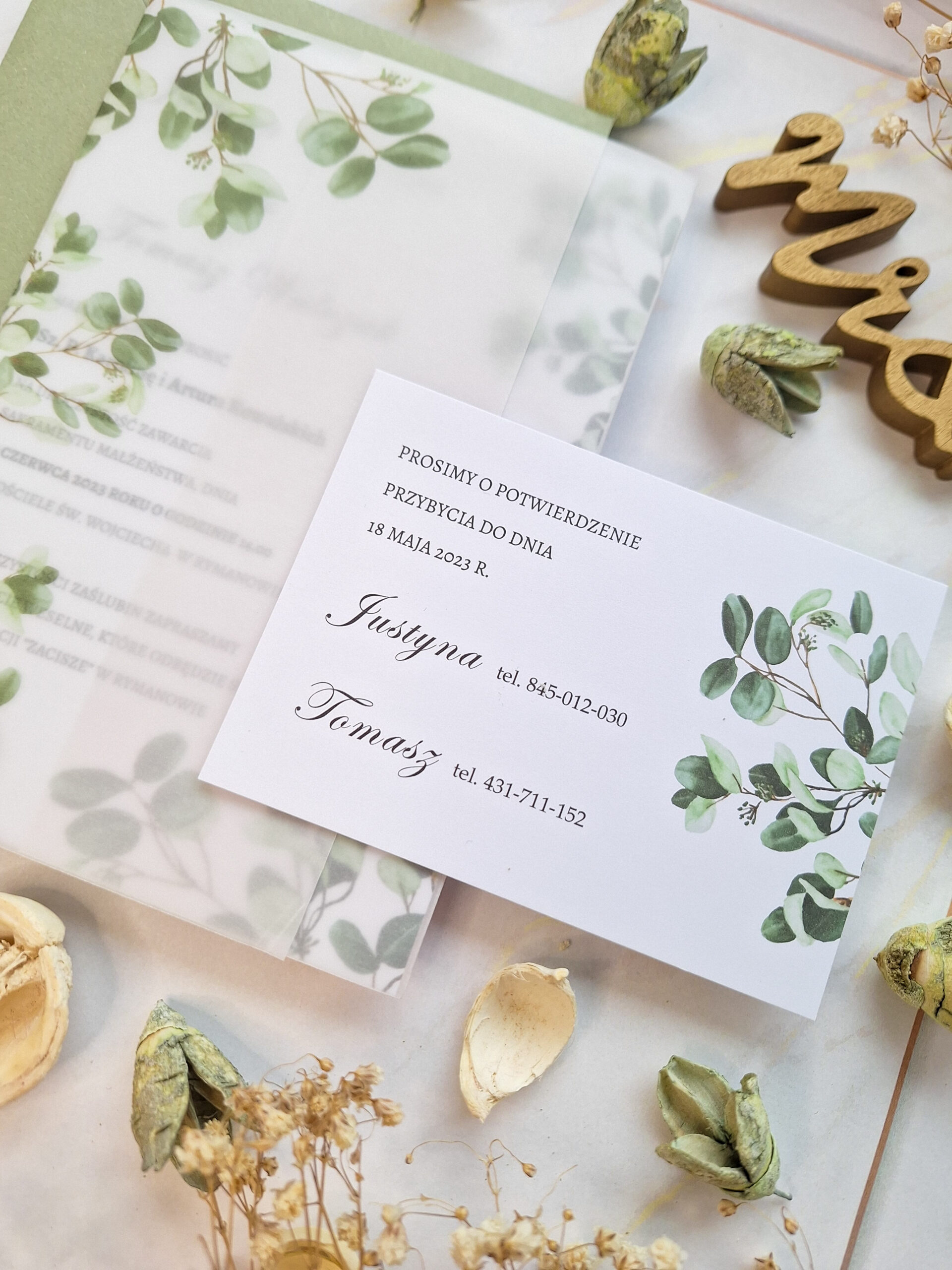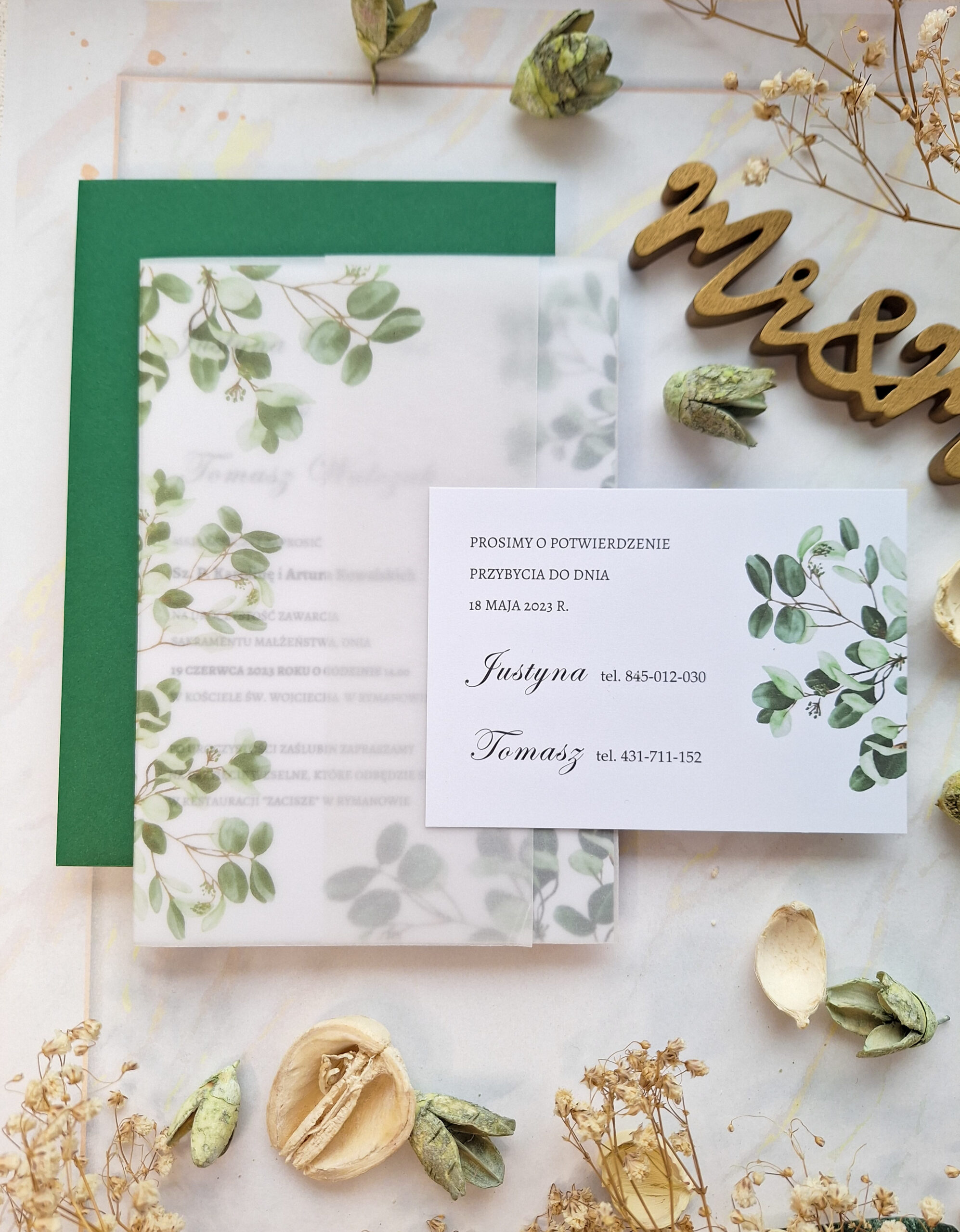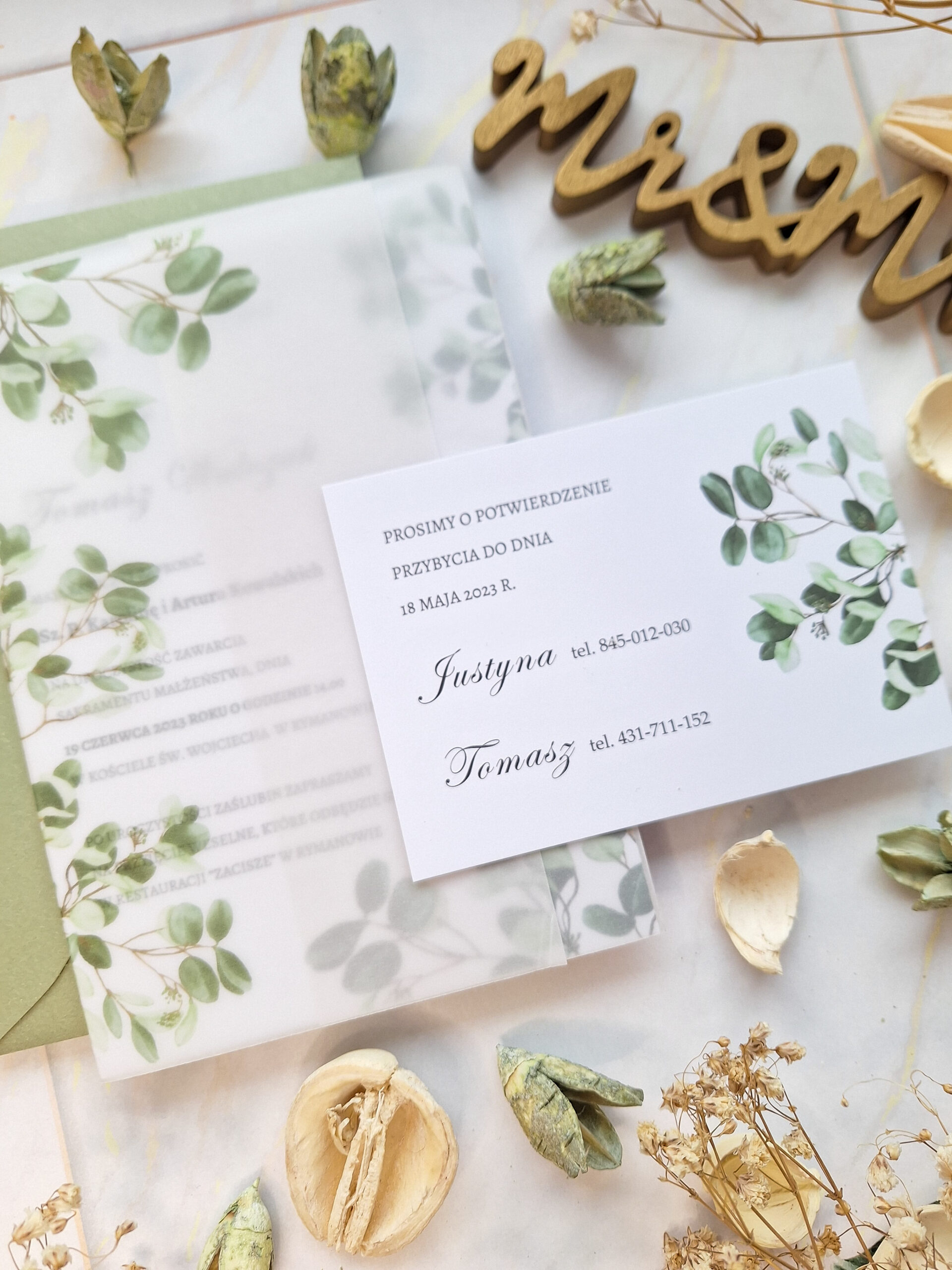 Zaproszenia minimalistyczne w eleganckim stylu z wzorem liści. Zamknięte w okładce z kalki z nadrukowanym motywem jak na karcie głównej. Drukowane jednostronnie na sztywnym matowym papierze 350g.