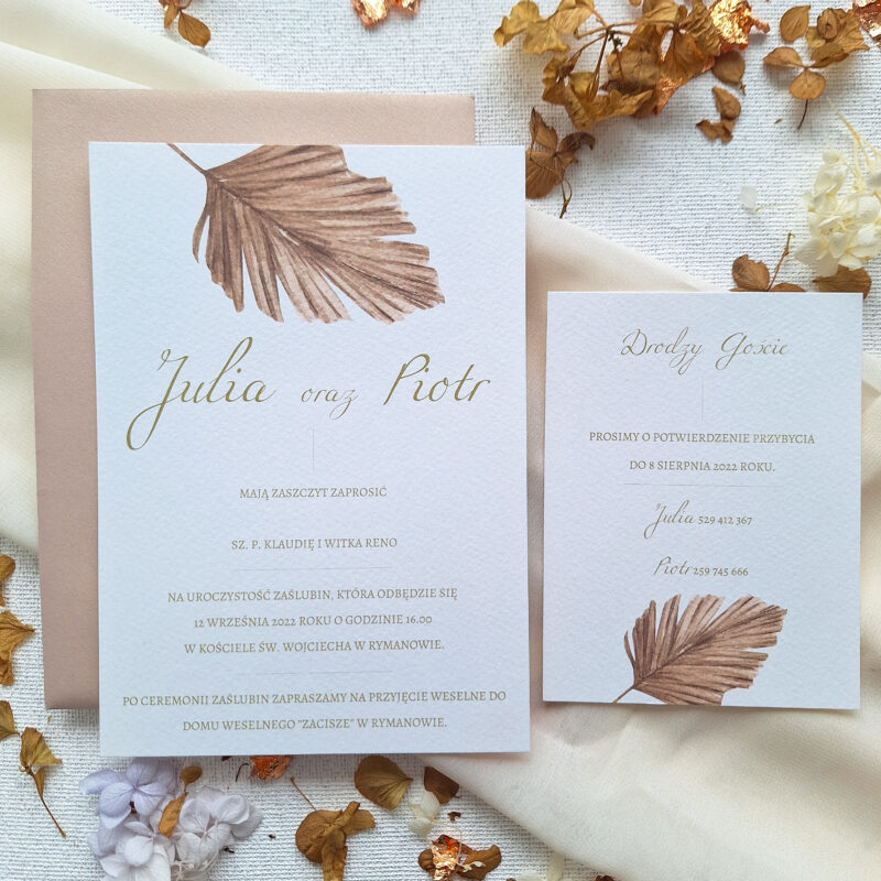 Jednokartkowe, minimalistyczne zaproszenia z motywem suszonych liści. Drukowane jednostronnie na kremowym fakturowanym papierze. Idealnie wpasują się w ślub w stylu boho lub naturalistycznym.
