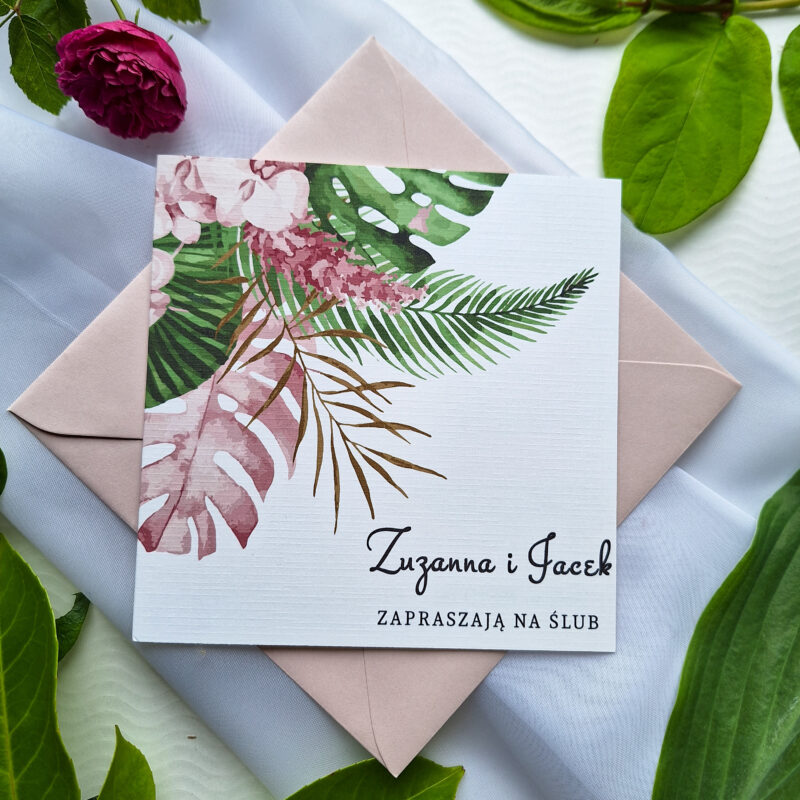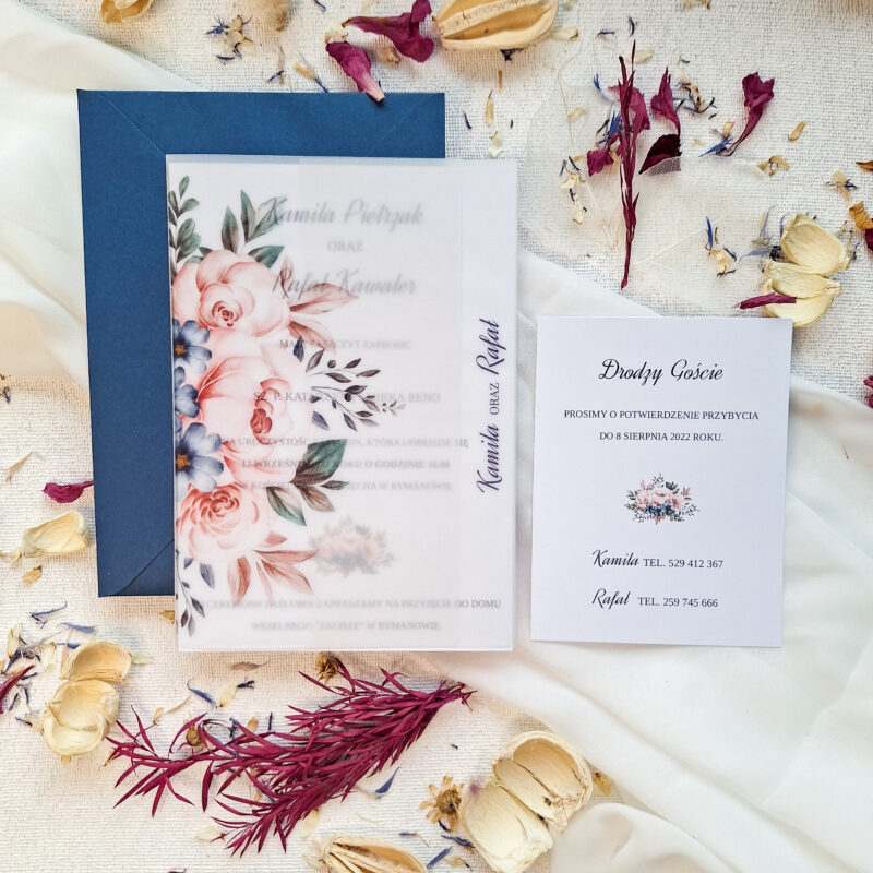 Zaproszenia minimalistyczne w eleganckim stylu z wzorem kwiatów. Zamknięte w okładce z kalki z nadrukowanym motywem jak na karcie głównej. Drukowane jednostronnie na sztywnym matowym papierze 350g.