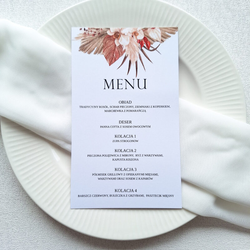 Menu jednokartkowe, drukowane na białym matowym papierze 350g/m2 Wymiary: około 12 x 20 cm Treść dowolna Grafika dowolna ( dopasujemy do Waszych zaproszeń)