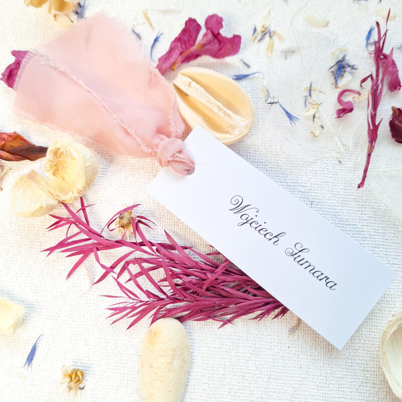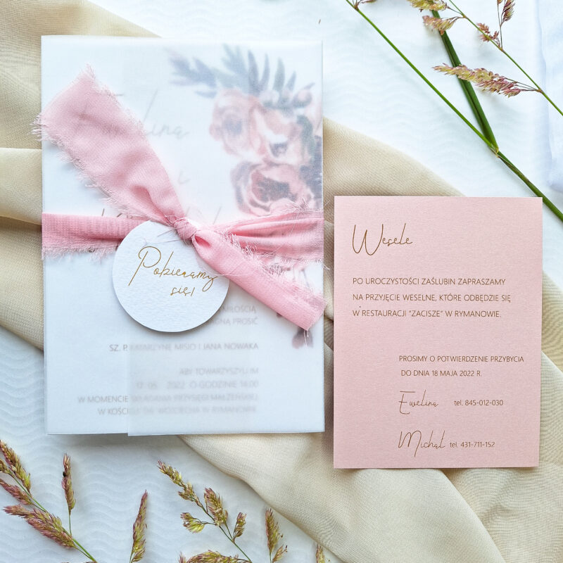 Zaproszenia minimalistyczne w stylu boho z wzorem suszonych różowych kwiatów. Jednokartkowe z dodatkowym bilecikiem. Zamknięte w okładce z kalki, przewiązanej szyfonową wstążką z ozdobną zawieszką. Drukowane jednostronnie na sztywnym matowym papierze 300g.
