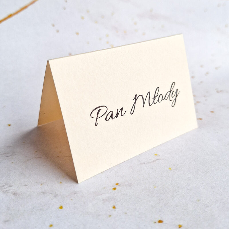 Klasyczna winietka składana, drukowana jednostronnie. Informacje o produkcie: Wymiary : Złożona około 11×5,5 cm Papier : Biały, matowy 300 g/m2 Czcionka dowolna (przykładowe czcionki wysyłamy po zakupie) Minimalna zamówiona ilość 30 sztuk