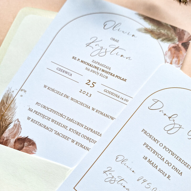 Zaproszenia jednokartkowe w stylu boho z motywem suszonego bukietu. Drukowane jednostronnie na białym, matowym papierze 350g/m2