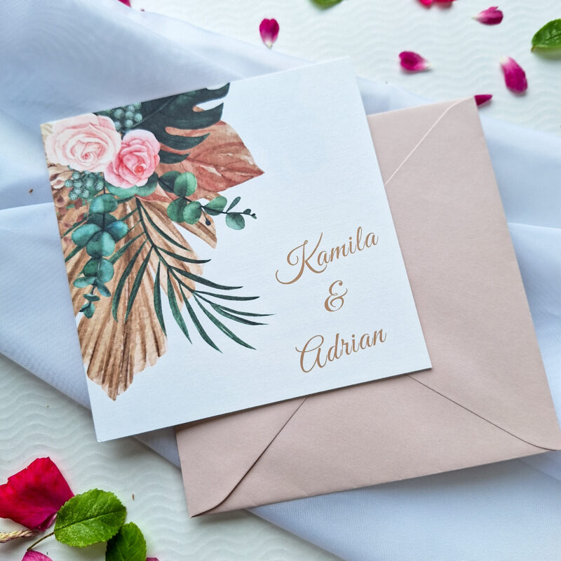 Zaproszenia minimalistyczne w eleganckim stylu z wzorem kwiatów. Zamknięte w okładce z kalki. Drukowane jednostronnie na sztywnym matowym papierze 350g.