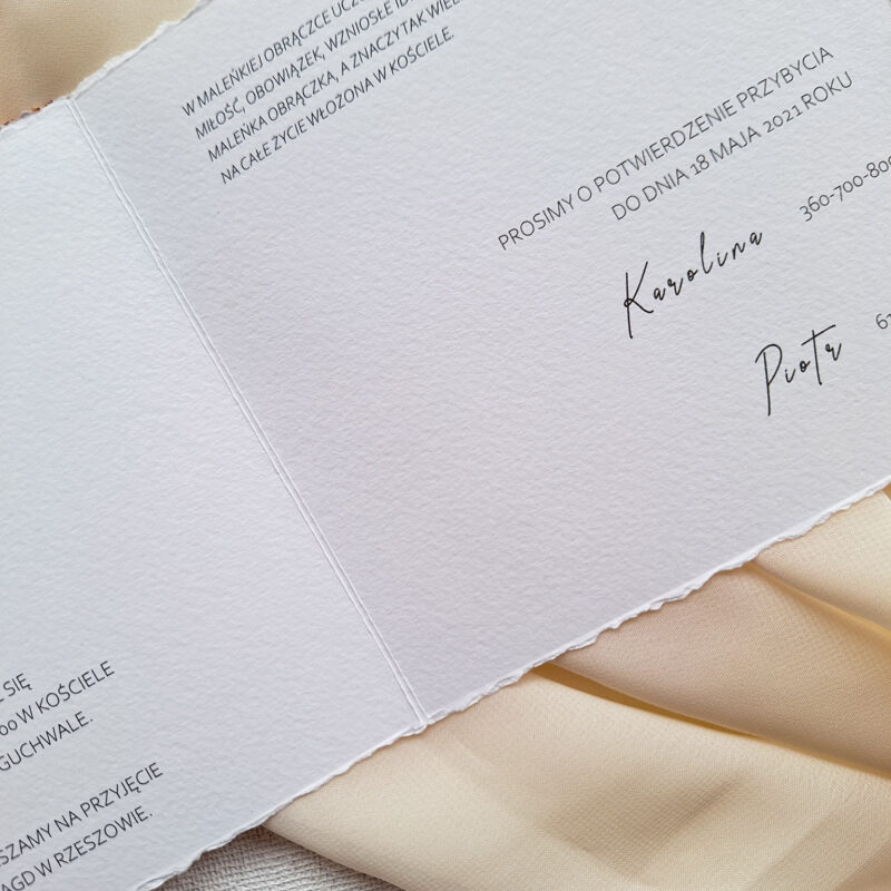 Minimalistyczne zaproszenia jednokartkowe z dodatkowym bilecikiem. Drukowane jednostronnie na białym, matowym papierze 350g. Brzegi zaproszenia ręcznie pozłacane.